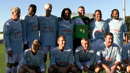 Emmanuel Macron scores penalty during charity football match